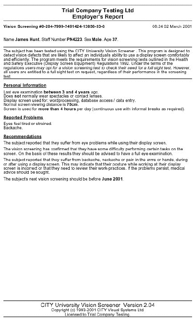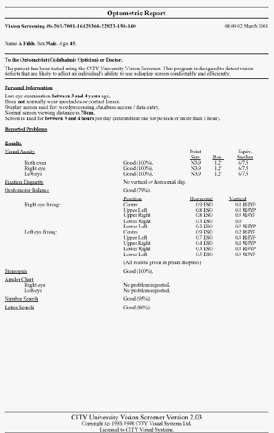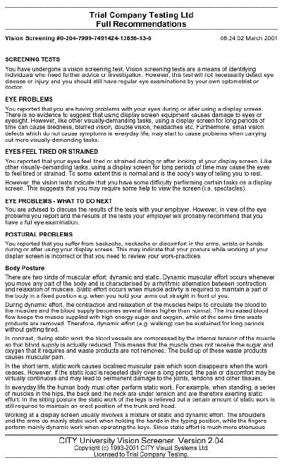 Optometric Report, this can provide useful information for the Optometrist.  A second page can be printed and used as a return form, clearly stating if any correction is only for DSE work.